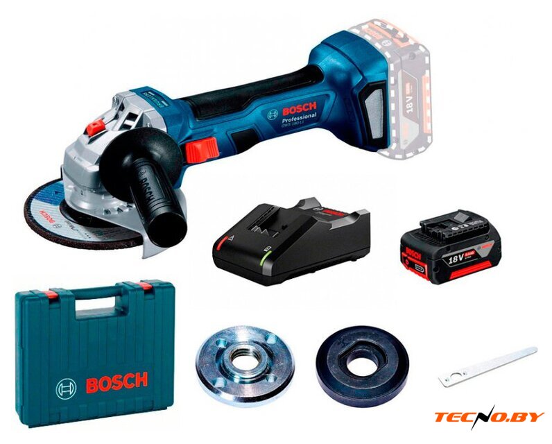 Комплект поставки | - Опорный фланец- Зажимная гайка- Ключ под два отверстия- Дополнительная рукоятка - Защитный кожух- Быстрозарядное устройство GAL 18V-40 Professional- Чемоданчик- 1 аккумулятор |