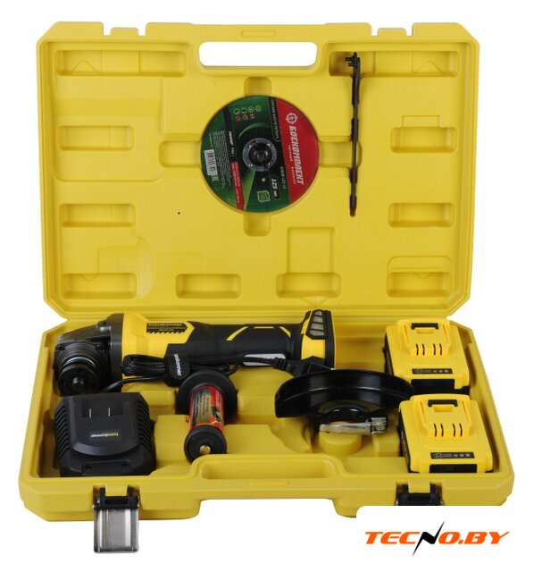 Комплект поставки | 1. Зарядное устройство- 1шт. 2. Аккумуляторная батарея- 2шт. 3. USB LED фонарик- 1шт. 4. Быстросъемный защитный кожух – 1шт. 5. Боковая рукоятка -1шт. 6. Гаечный ключ -1шт. 7. Разметочный карандаш с твердосплавным наконечником -1шт. 8. Абразивный диск "Боекомплект"-1шт. |