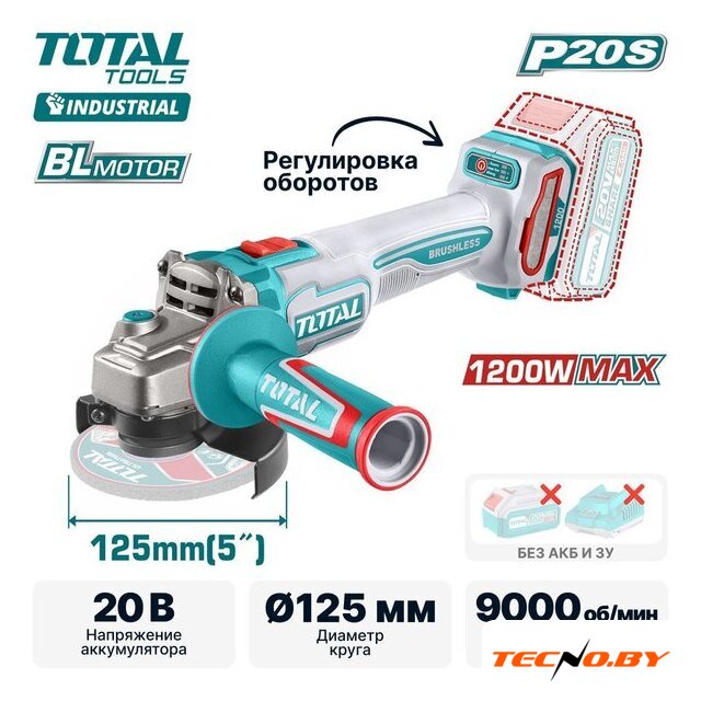 диаметр диска: 125 мм, 4700–8100 об/мин холостого хода, регулировка скорости оборотов, питание: аккумуляторный (20 В), аккумулятор в комплекте, 2.15 кг