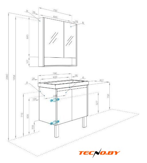 тумба под умывальник, подвесная/напольная установка, ширина: 63 см