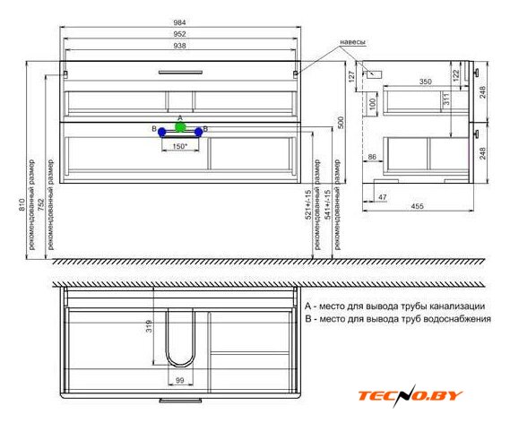 тумба под умывальник, подвесная установка, ширина: 60 см