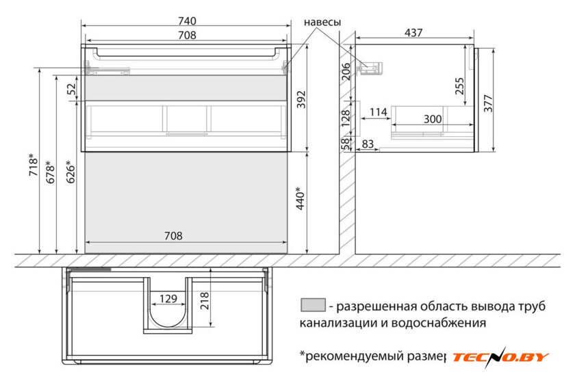 тумба под умывальник, подвесная установка, ширина: 69 см