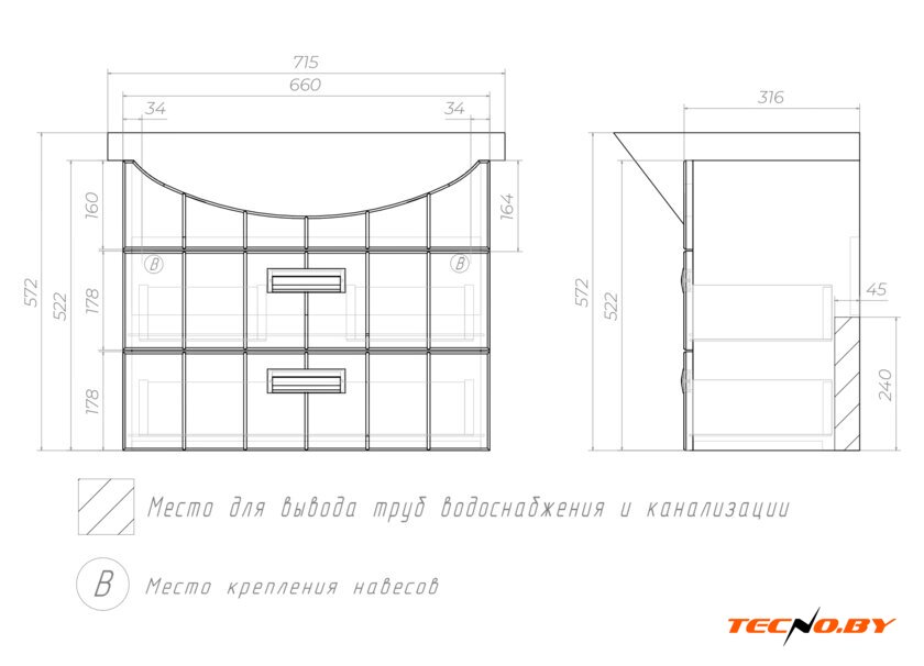 тумба под умывальник, подвесная/напольная установка, ширина: 45 см