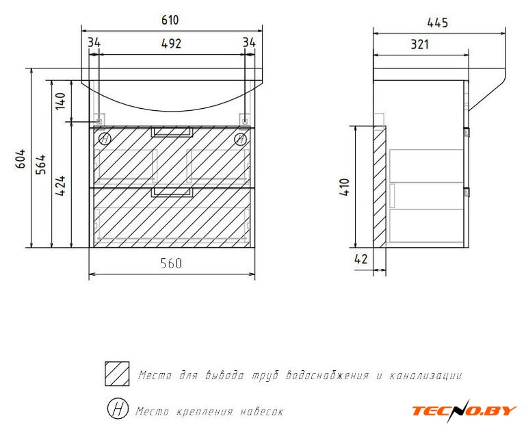 тумба под умывальник, напольная/подвесная установка, ширина: 66 см