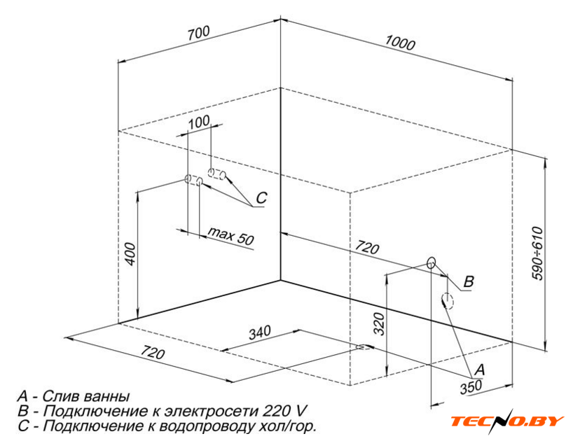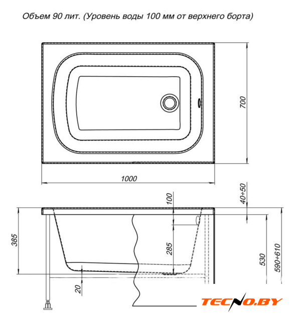 Компактные размеры ванны — длина 100 см, ширина 70 см и высота 61 см — делают ее идеальной для небольших помещений, сохраняя при этом достаточную вместимость для комфортного купания. С полезным объемом 90 литров, ванна предлагает удобное и расслабляющее пространство для одного человека.