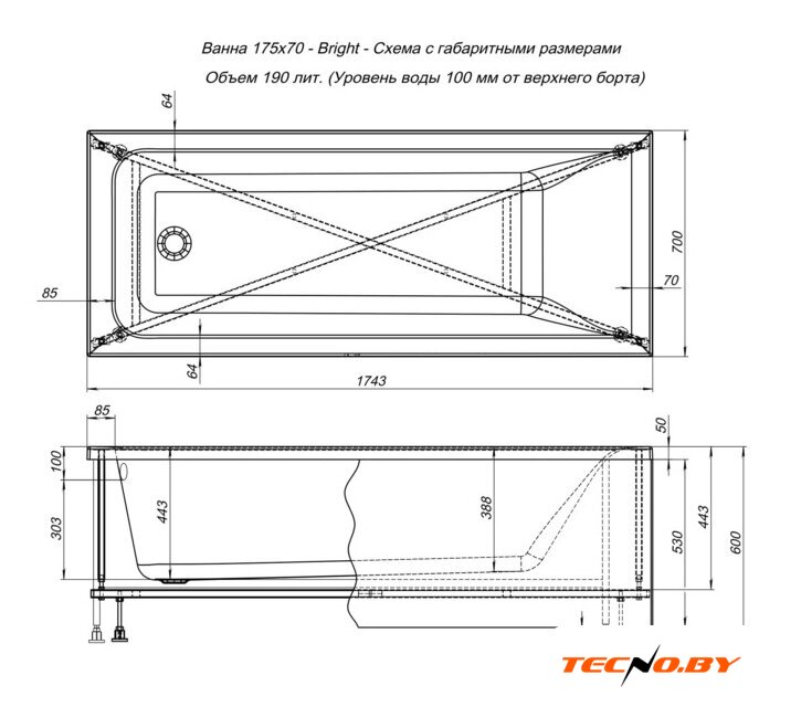 С длиной 174.5 см и шириной 70 см, ванна Aquanet Bright идеально подходит для одного человека, обеспечивая максимальный комфорт при принятии водных процедур. Высота в 60 см и глубина ванны 39.3 см делают ее использование невероятно удобным, а полезный объем в 190 литров достаточно велик для создания расслабляющей атмосферы, полной удовольствия.