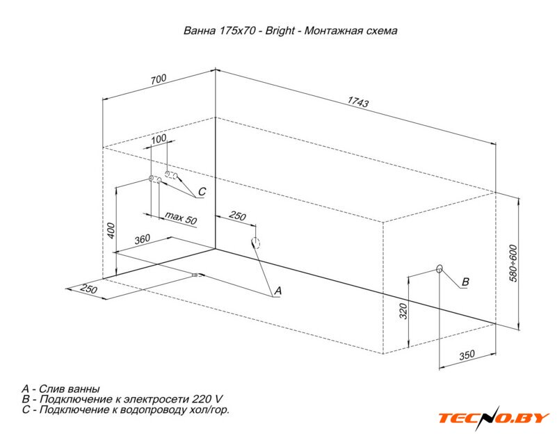 Ванна Aquanet Bright не является отдельностоящей, что позволяет ей легко вписаться в пространство вашей ванной комнаты, экономя место и сохраняя функциональность. Отсутствие дополнительных аксессуаров, таких как ручной душ или подсветка, подчеркивает ее лаконичность и сосредоточенность на основных функциях.