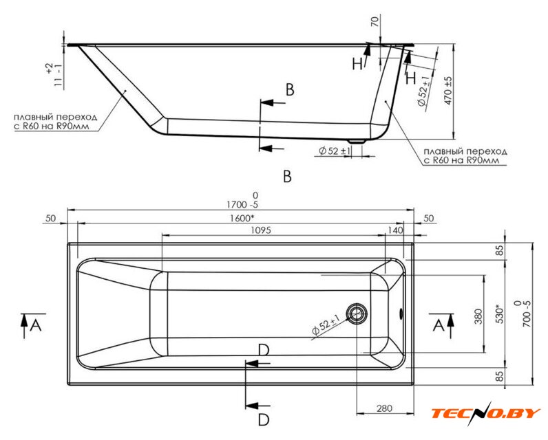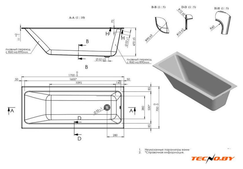 прямая, акрил, объем: 170 л