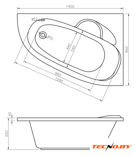 Длина ванны составляет 140 см, ширина - 95 см, а высота - 42 см, что делает ее идеальной для комфортного принятия водных процедур в одиночку. Несмотря на отсутствие встроенных обогревателей и дополнительных функций, ванна предлагает достаточно пространства для расслабления и восстановления. Опционально доступен подголовник для максимального комфорта.