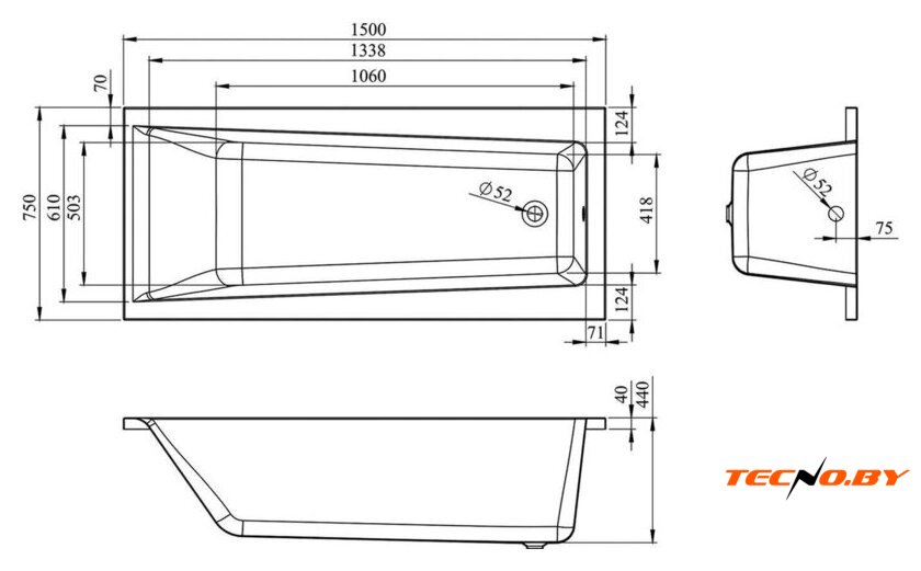 Ванна имеет прямую форму, которая совместима с большинством дизайнерских решений. Ее габариты – длина 150 см, ширина 75 см и высота 44 см – оптимальны для установки в ванных комнатах разных размеров. Полезный объем ванны – 165 литров – позволяет полностью погрузиться в воду и насладиться комфортом. Несмотря на небольшие размеры, ванна обеспечивает пространство для комфортного пребывания одного человека.
