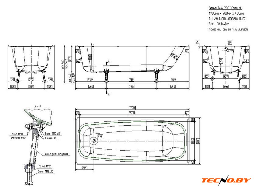 Размеры ванны составляют 170 см в длину и 70 см в ширину, что делает ее идеальной для комфортного приема водных процедур. Глубина ванны в 40 см обеспечивает достаточную вместительность с полезным объемом 196 литров, предоставляя вам возможность расслабляться в полной мере. Вес изделия составляет 102 кг, что говорит о его устойчивости и надежности.