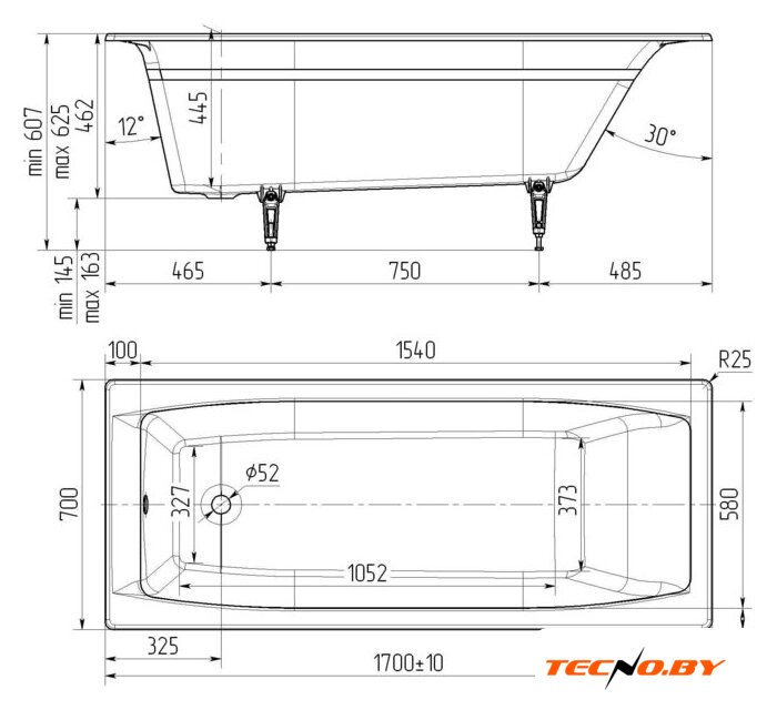 С длиной 170 см и шириной 70 см ванна предлагает достаточное пространство для комфортного принятия водных процедур. Полезный объем в 195 литров позволяет насладиться расслабляющим купанием после долгого дня. Высота ванны составляет всего 46.2 см, что обеспечивает удобный вход и выход.
