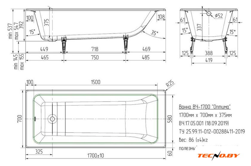 Ванна имеет оптимальные размеры: длина 170 см, ширина 70 см и высота 54.7 см, обеспечивая удобное пространство для одного человека. Полезный объем в 160 литров позволяет полностью расслабиться и насладиться временем, проведенным в теплой воде. Эта ванна станет идеальным выбором для небольших ванных комнат, не уступая по комфорту большим моделям.