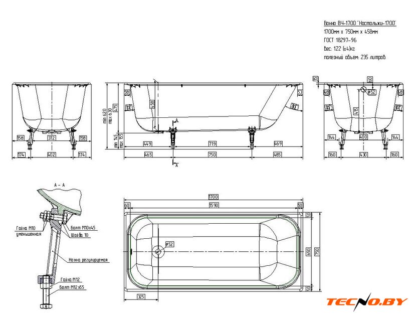 170x75 см, объём: 235 л