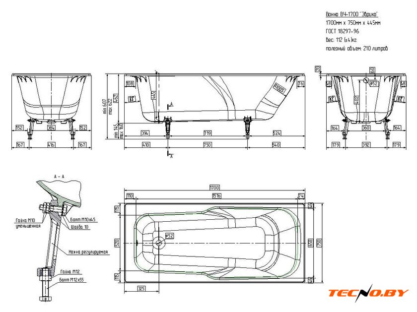 Размеры ванны 170x75 см позволяют комфортно разместиться внутри, наслаждаясь купанием. Глубина ванны 44.5 см и полезный объем 210 литров обеспечивают достаточное пространство для погружения. Высота 61.5 см делает ее удобной для пользователей всех возрастов, облегчая процесс входа и выхода.