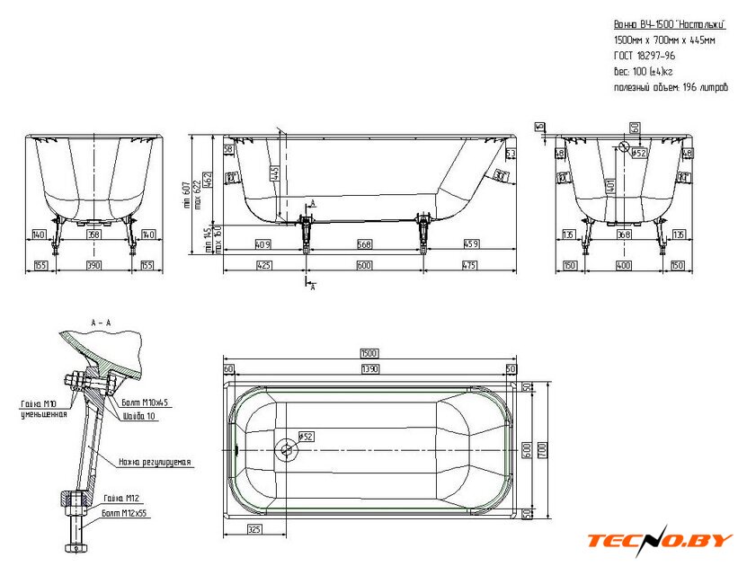 Габариты ванны — 150 см в длину, 70 см в ширину и 61.5 см в высоту — оптимальны для одной персоны, создавая достаточное пространство для комфортного принятия водных процедур. Глубина чаши составляет 44.5 см, что позволяет достичь полезного объема в 196 литров. Несмотря на свои размеры, ванна обладает значительной массой — 94 кг, что свидетельствует о ее устойчивости и прочности.