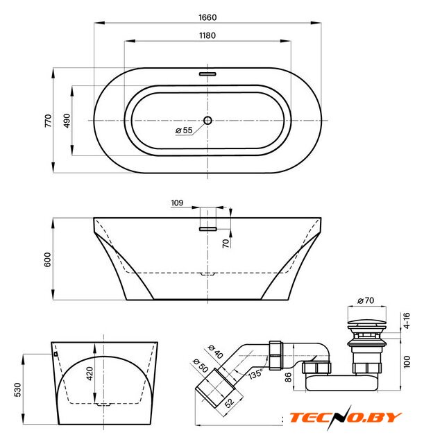 овальная, литьевой акрил, отдельностоящая, объем: 350 л