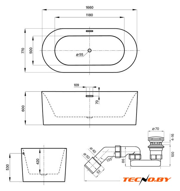 овальная, литьевой акрил, отдельностоящая, объем: 280 л