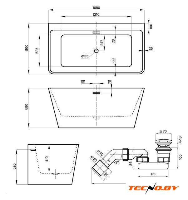 Отдельностоящая ванна имеет размеры 168x80 см, что делает ее идеальным выбором для ванной комнаты средней величины. Высота ванны составляет 58 см, а глубина — 41 см, что создает оптимальные условия для приема расслабляющих ванн. Полезный объем ванны — впечатляющие 309 литров, что дает достаточно пространства для комфортного использования одноместного купания.