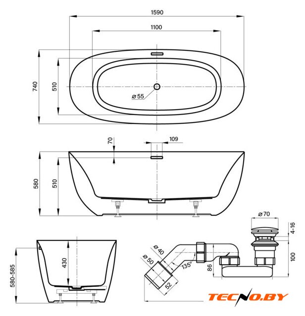 Ванна имеет длину 159 см, ширину 74 см и высоту 58 см, что делает ее удобной для пользователя любого роста. Глубина чаши в 43 см обеспечивает комфортное погружение, создавая идеальные условия для полного релакса. Ее полезный объем составляет 210 литров, что позволяет наслаждаться полноценным купанием. Несмотря на отсутствие антискользящего покрытия и ручек, ванна проектировалась с учетом максимального удобства и эргономики.