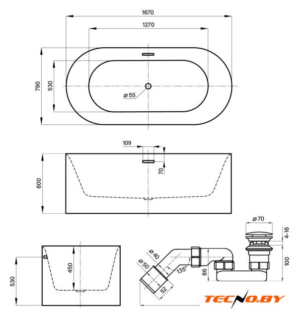 овальная, литьевой акрил, отдельностоящая, объем: 273 л