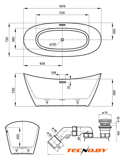 овальная, литьевой акрил, отдельностоящая, объем: 348 л