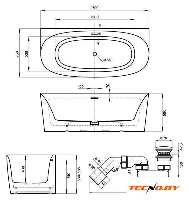 В комплектацию входят каркас и декоративный экран, предлагая легкость установки и эстетичное завершение вашего интерьерного решения. Сифон-автомат с хромированным покрытием уже встроен, обеспечивая удобство слива и предотвращение переполнения ванны водой.