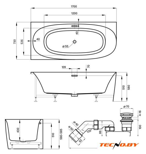 170x75 см, объём: 260 л