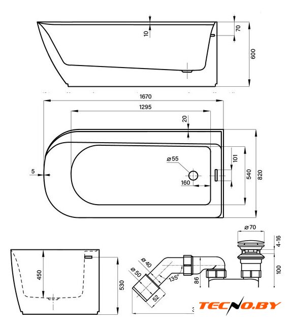 нестандартная, литьевой акрил, отдельностоящая, объем: 271 л