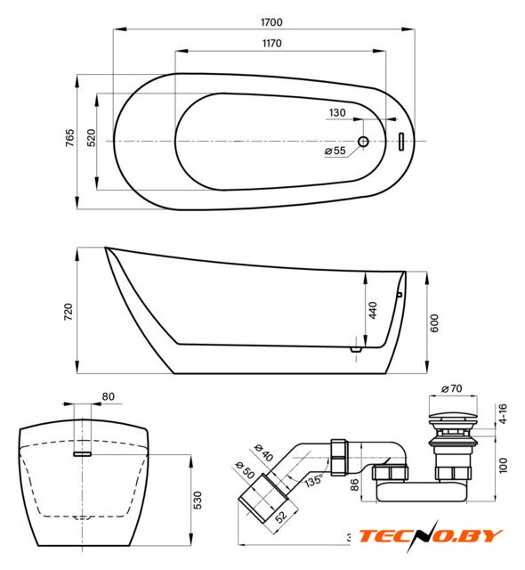овальная, литьевой акрил, отдельностоящая, объем: 280 л