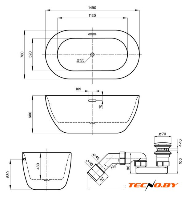 С длиной 149 см, шириной 78 см и высотой 60 см, эта ванна отлично подойдет для большинства ванных комнат. Глубина в 43 см и полезный объем в 269 литров предоставят вам возможность полностью расслабиться и насладиться каждой минутой принятия ванны.