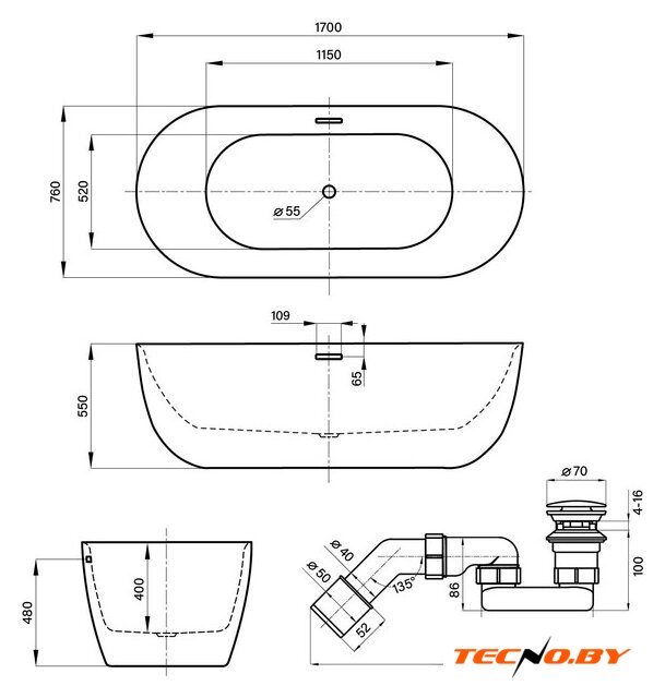 Эта отдельно стоящая ванна создана для максимального комфорта одного пользователя. С длиной в 170 см и шириной в 76 см, ванна обеспечивает простор, а глубина в 40 см позволяет насладиться полноценным расслаблением. Общий полезный объем в 280 литров позволяет создать достаточный уровень воды для комфортного принятия ванны. Отсутствие противоскользящего покрытия дна требует осторожности при использовании, но это компенсируется высоким уровнем стиля и утонченности.