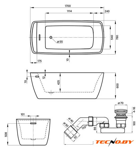Эта отдельно стоящая ванна изготовлена из литьевого акрила, что обеспечивает долгую службу и высокое качество. Ее размеры — 170 см в длину и 78 см в ширину — создают комфортное и расслабляющее пространство для купания. Глубина ванны составляет 42,5 см, что позволяет наполнить ее до 295 литров воды для полноценного расслабления после долгого дня.