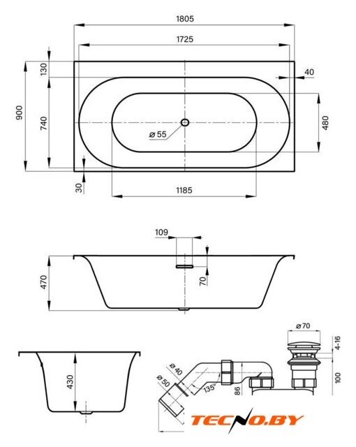 Ванна Wellsee Dream For More 181x90 23790103R (встраиваемая ванна белый глянец, сифон-автомат матовый черный)