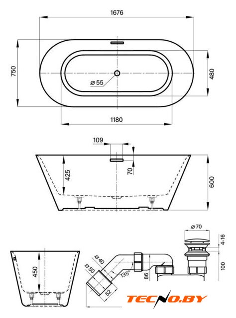 овальная, литьевой акрил, отдельностоящая, объем: 279 л