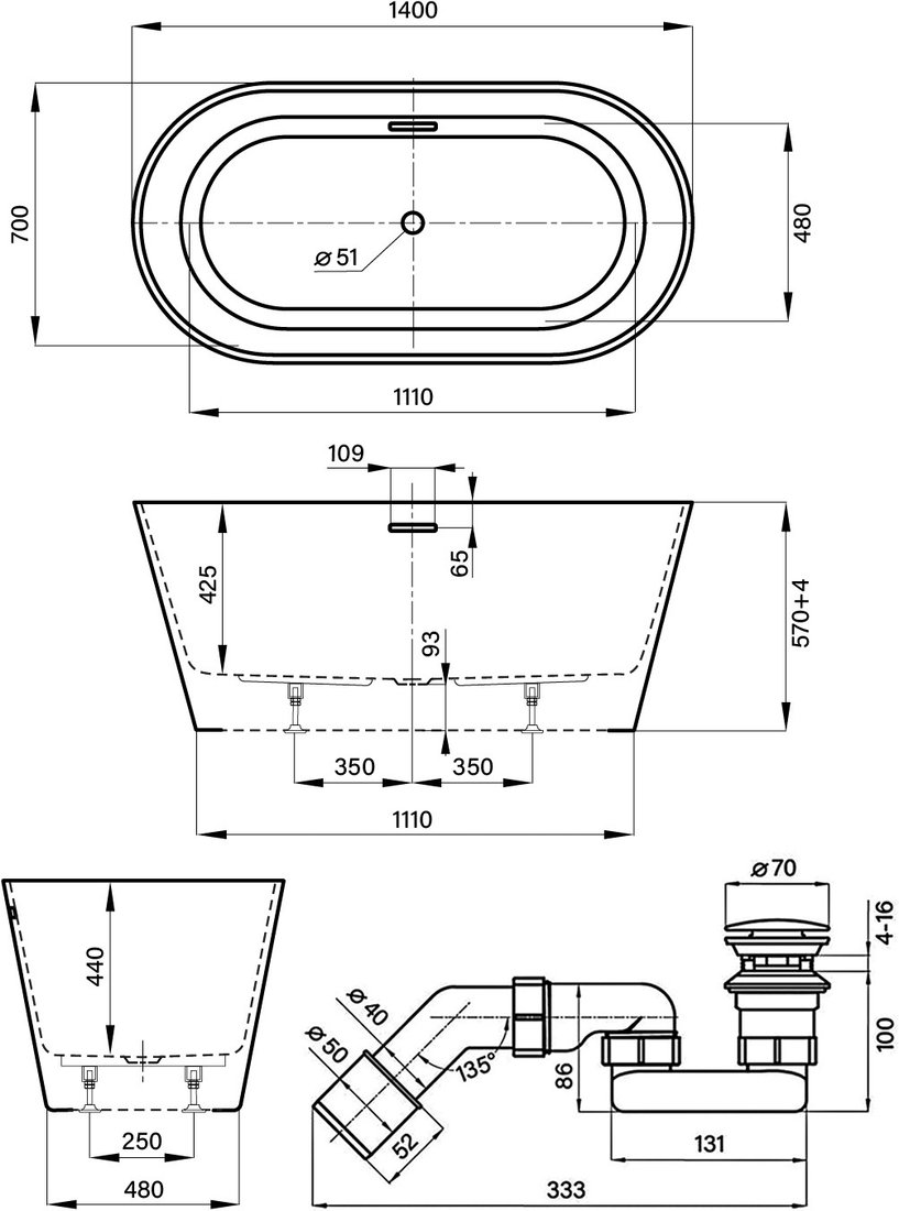 овальная, литьевой акрил, отдельностоящая, объем: 234 л