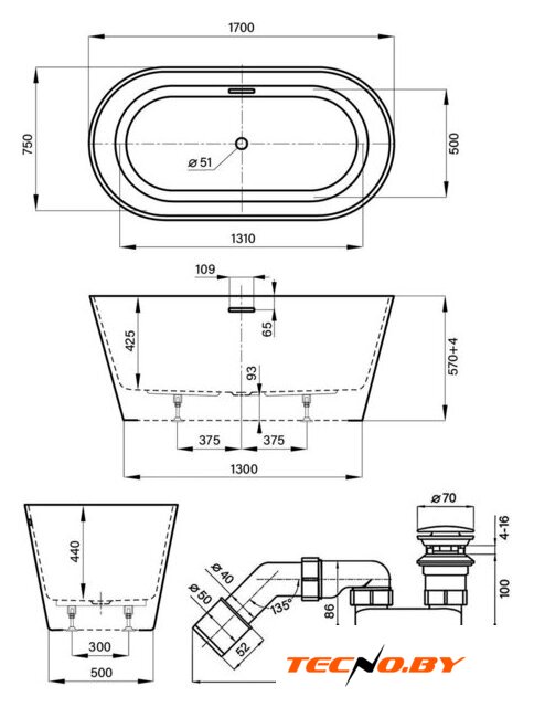 170x75 см, объём: 277 л