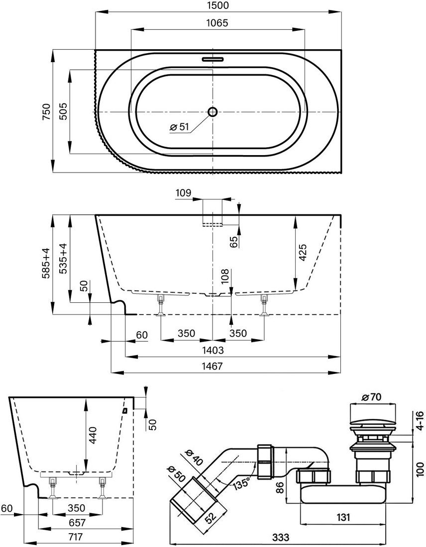 овальная, литьевой акрил, отдельностоящая, объем: 188 л