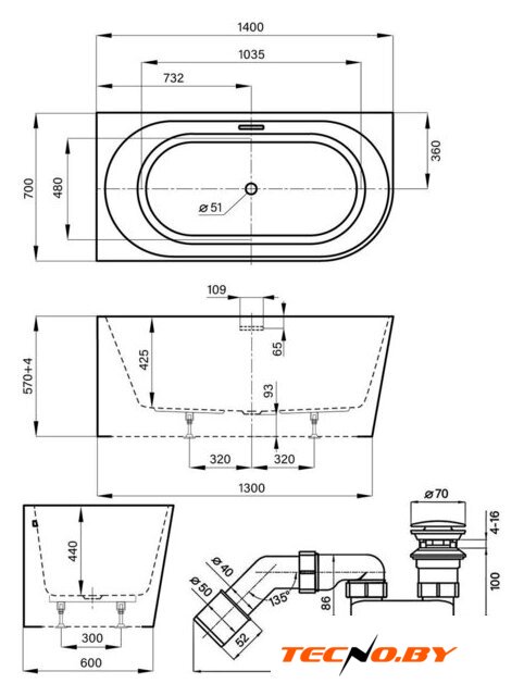 прямая, литьевой акрил, отдельностоящая, объем: 277 л