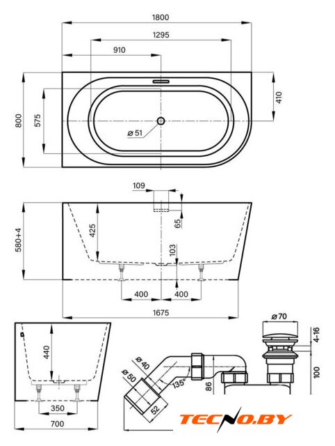 прямая, литьевой акрил, отдельностоящая, объем: 300 л