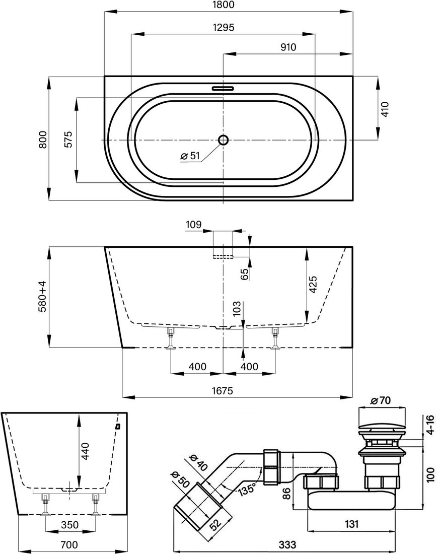 овальная, литьевой акрил, отдельностоящая, объем: 348 л