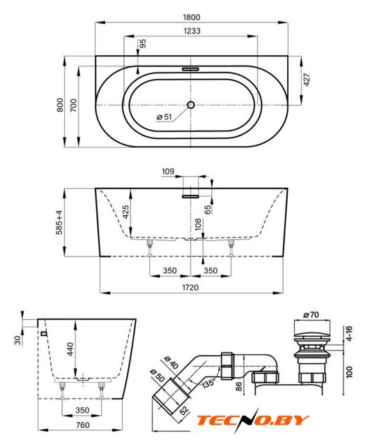 Ванна Wellsee Collaro 180x80 28910204R (пристенная ванна белый глянец, экран, ножки, сифон-автомат золото)