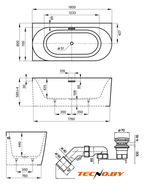 овальная, литьевой акрил, отдельностоящая, объем: 350 л