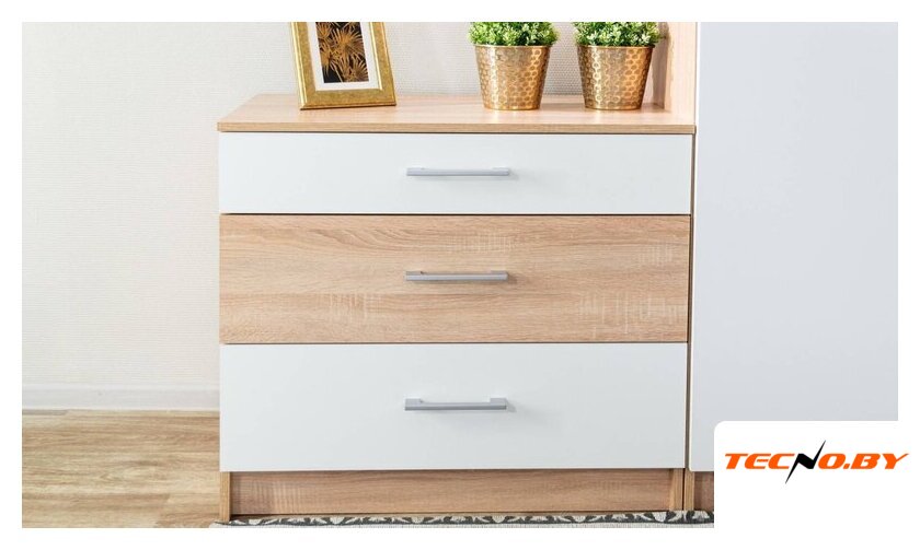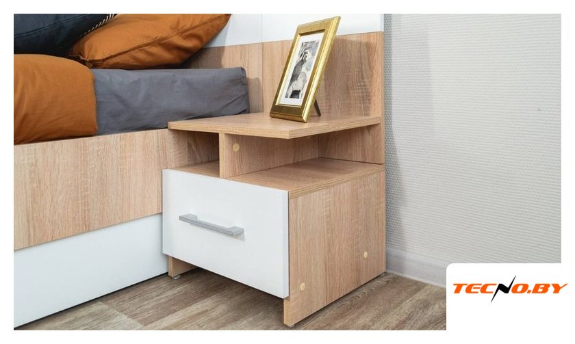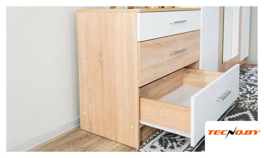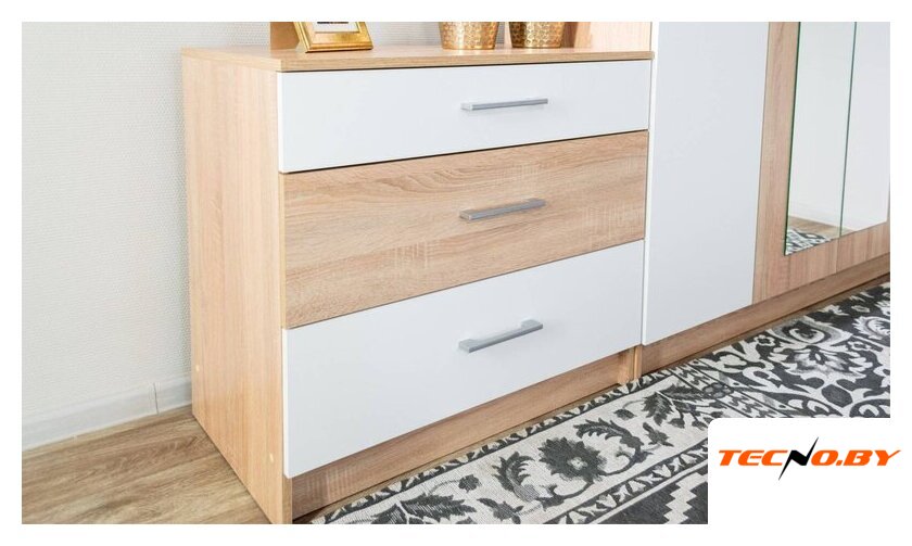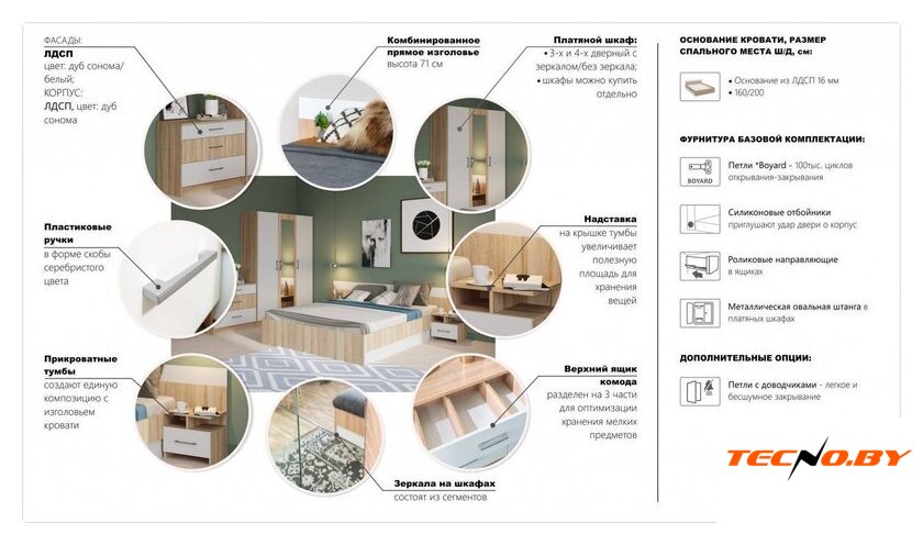 шкаф/двуспальная кровать/комод/тумба, фасад ЛДСП/зеркало/пластик (дерево светлое/белый), каркас ЛДСП/ЛХДФ (дерево светлое/белый), спальное место 200x160 см