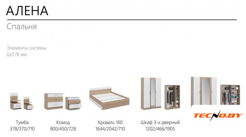 | Состав комплекта | двуспальная кровать, комод, тумба, шкаф |
