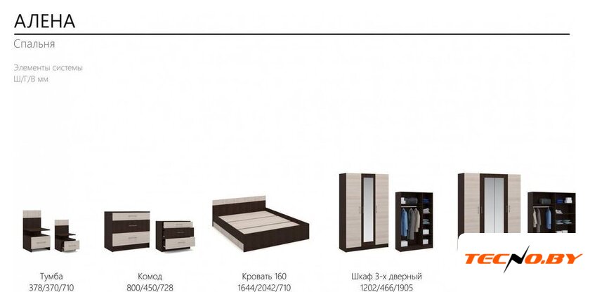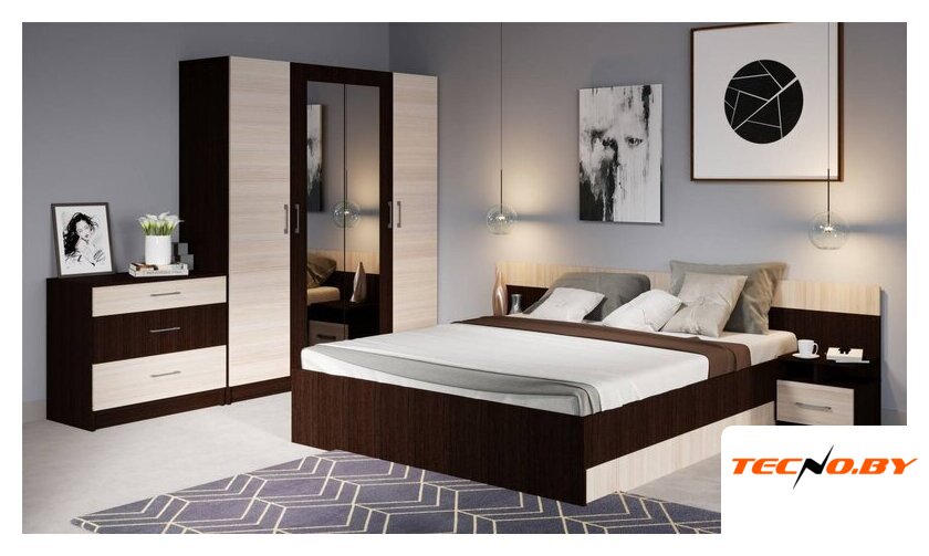 | Состав комплекта | двуспальная кровать, комод, тумба, шкаф |