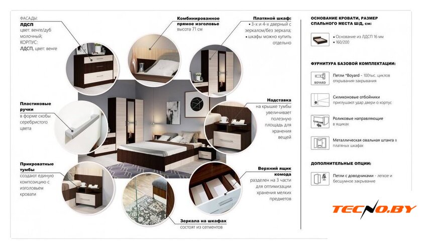 шкаф/двуспальная кровать/комод/тумба, фасад ЛДСП/зеркало/пластик (дерево светлое/белый), каркас ЛДСП/ЛХДФ (дерево светлое/белый), спальное место 200x160 см