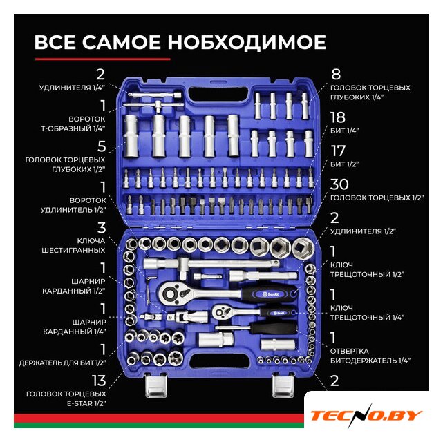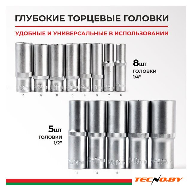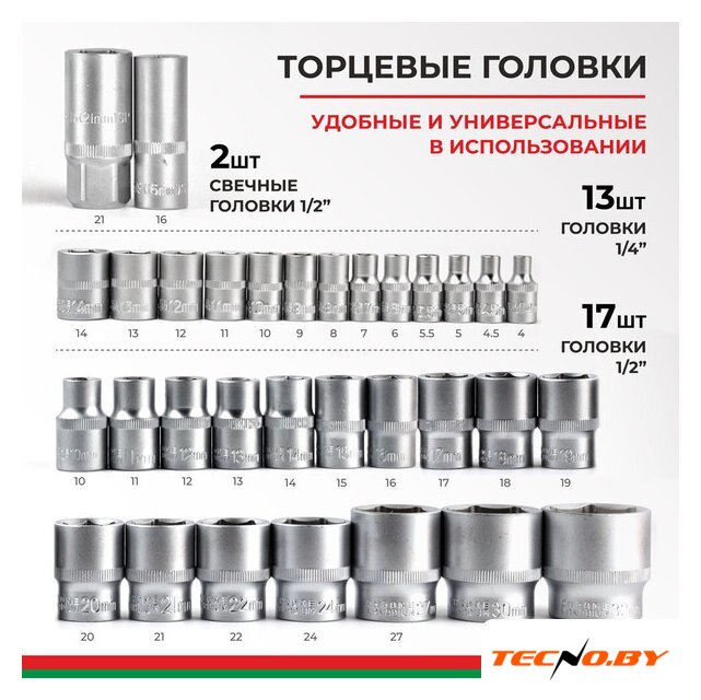 94 шт, головка простая, профиль головки: шестигранная, размер мама (F): 1/2", 1/4", рабочий размер 4-32 мм