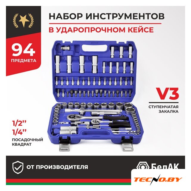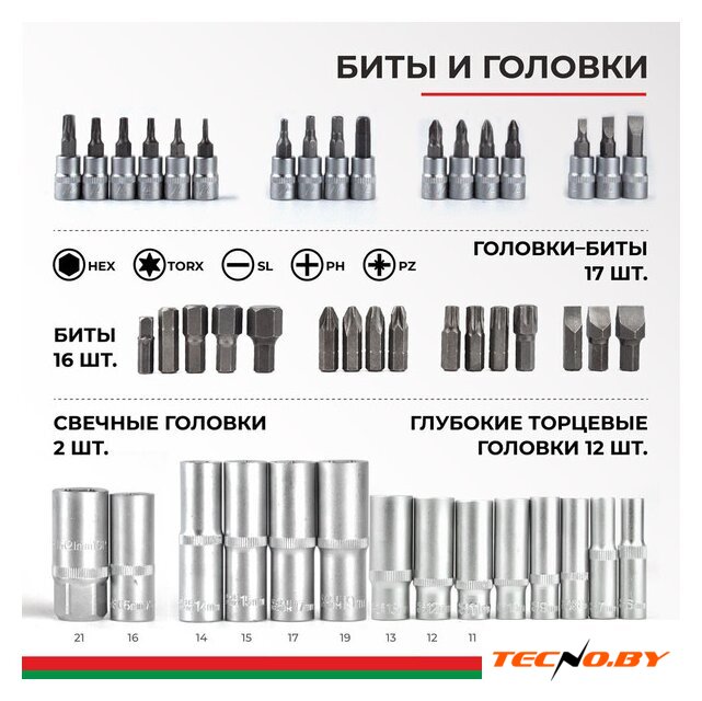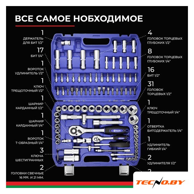 | Комплектация | кейс, держатель бит, адаптер, удлинитель, вороток, кардан, трещотка, отвертка |