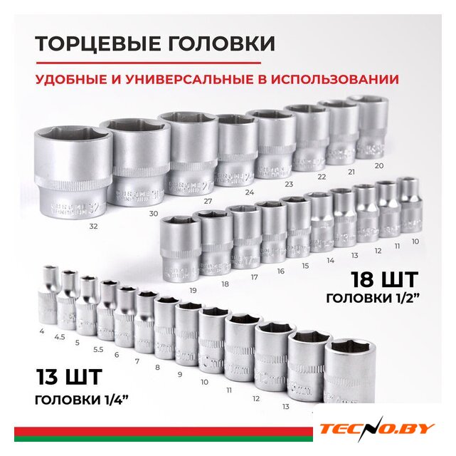 108 шт, головка простая, профиль головки: шестигранная, размер мама (F): 1/2", 1/4", рабочий размер 4-32 мм
